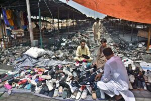 People selecting and purchasing shoes from a makeshift stall at H-9 weekly bazaar in Federal Capital