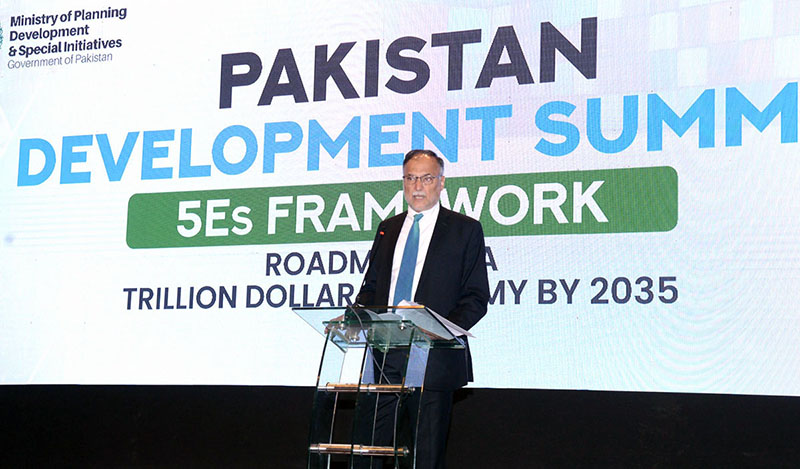 Planning Minister Ahsan Iqbal delivering keynote address during Pakistan Development Summit on the theme “5Es Framework: Roadmap to a Trillion Dollar Economy by 2035,” at Pakistan China Friendship Center.