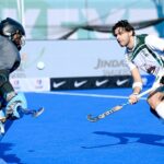 Players in action in handball match played between Multan Board and Lahore Board teams during Pakistan Inter Board Girls Handball Championship at BISE Ground.