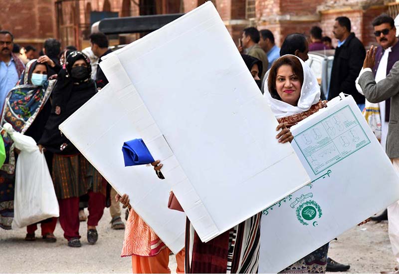 PESHAWAR: February 07 – Presiding officers carrying electoral material from distribution point at Qayyum Sports Complex. APP/SYR/ MAF/TZD/ABB