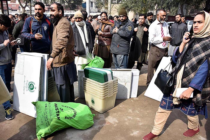 LAHORE: February 07 – Polling staff receiving polling material at distribution Centre for General Elections 2024.