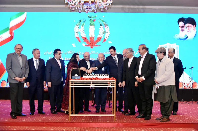 President Asif Ali Zardari, accompanied by Faisal Karim Kundi, Governor Khyber Pakhtunkhwa; Syed Mehdi Shah, Governor Gilgit-Baltistan; Jam Kamal Khan, Federal Minister for Commerce; Ambassador of Iran, Dr. Reza Amiri Moghaddam, and other dignitaries, cuts a cake at a reception to commemorate the 47th Anniversary of the Victory of the Islamic Revolution of Iran and Iran’s National Day