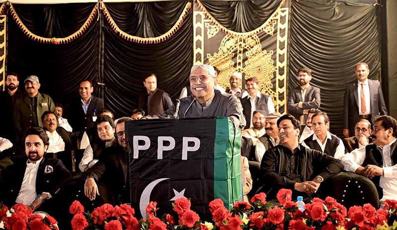 President Asif Ali Zardari addresses a public gathering at the residence of President PPP South Punjab Makhdoom Ahmed Mahmood