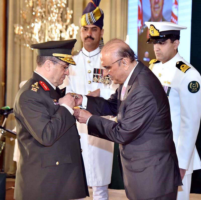 President Asif Ali Zardari conferring the award of Nishan-i-Imtiaz (Military) upon the Commander of Turkish Land Forces, General Selcuk Bayraktaroglu, during a special investiture ceremony held at Aiwan-e-Sadr.
