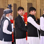 President Asif Ali Zardari conferring the award of Sitara-i-Imtiaz upon Mr Muhammad Hussain (Murad Sadpara) in recognition of his services in the field of Sports (Mountaineering), at the investiture ceremony to confer the insignias of Civil Awards, held at Aiwan-e-Sadr. His widow is receiving his award.