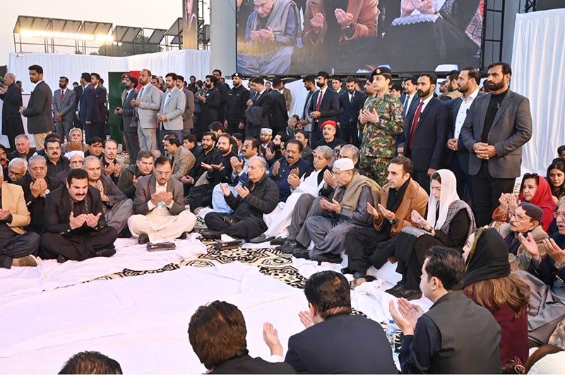 President Asif Ali Zardari, First Lady Bibi Aseefa Bhutto Zardari, Chairman Pakistan People’s Party Bilawal Bhutto Zardari and other party leaders offering fateha on the martyrdom anniversary of Shaheed Mohtarma Benazir Bhutto.