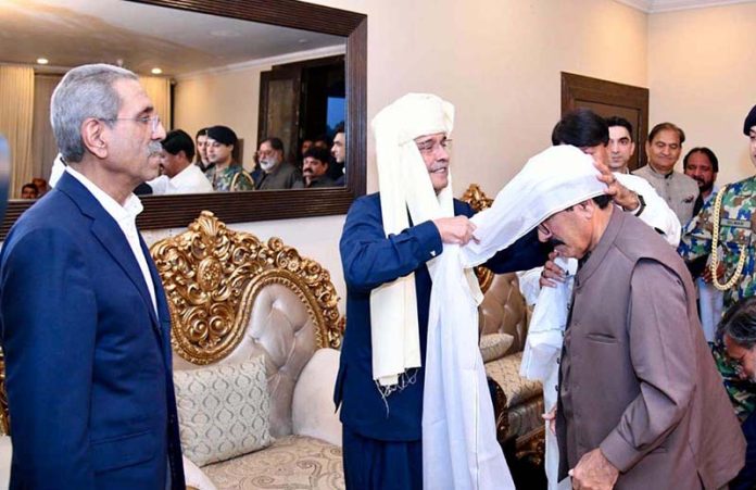 President Asif Ali Zardari formally wraps the turban of chieftainship on Sardar Noorulzaman Khan Gopang, marking his succession as Chief of the Gopang tribe.