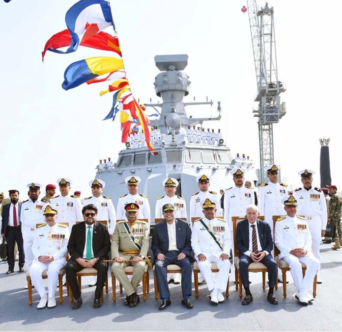President Asif Ali Zardari in a group photo with senior military officials and crew of Pakistan Navy Ship Babur during its induction ceremony