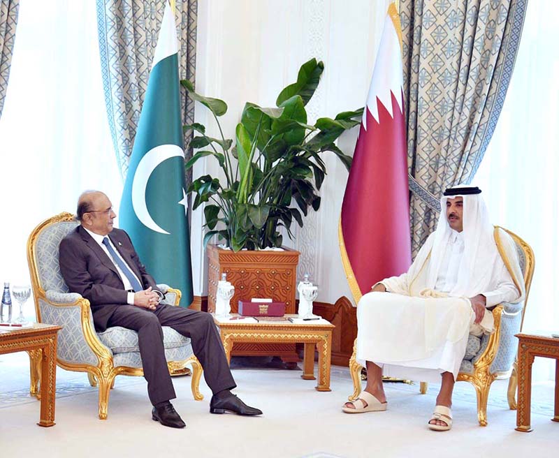 President Asif Ali Zardari in a meeting with His Highness Sheikh Tamim bin Hamad Al Thani, Amir of the State of Qatar at the Amiri Palace.