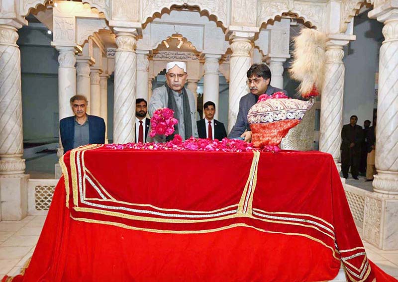President Asif Ali Zardari offering fateha and laying flowers at the grave of Shaheed Zulfikar Ali Bhutto in Garhi Khuda Bakhsh.