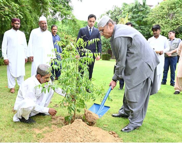 President Asif Ali Zardari planting a “Neem” sapling at Bilawal House as part of the Monsoon Tree Plantation Campaign