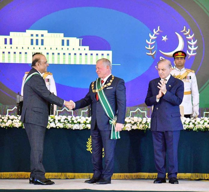 President Asif Ali Zardari shaking hands with His Majesty King Abdullah II ibn Al-Hussein of Jordan after the King conferred the Wisam al-Nahdah al-Mursa‘ award on him at Aiwan-e-Sadr.