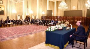 ISLAMABAD: August 01 – President Asif Ali Zardari speaking to a delegation of the Federation of Pakistan Chambers of Commerce & Industry, comprising of businessmen and office-bearers of 40 regional business associations, led by Gohar Ejaz, at Aiwan-e-Sadr.