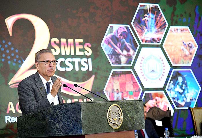 President Dr. Arif Alvi addressing the 2nd Islamabad Chamber of Small Traders and Small Industries achievement recognition ceremony at Aiwan-e-Sadr