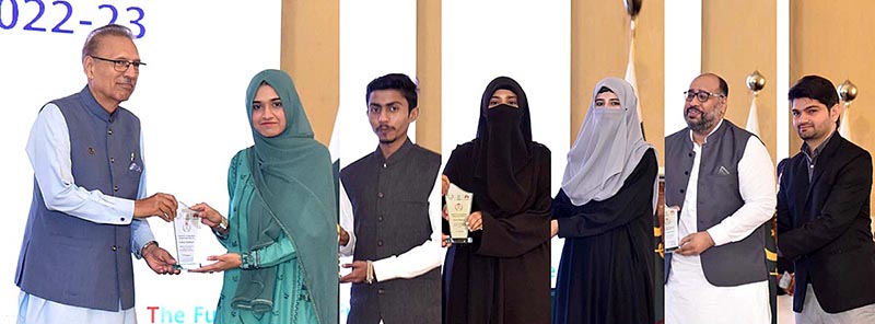 President Dr. Arif Alvi giving away recognition shields to the high achievers of the Huawei ICT Competition 2022-23 at Aiwan-e-Sadr