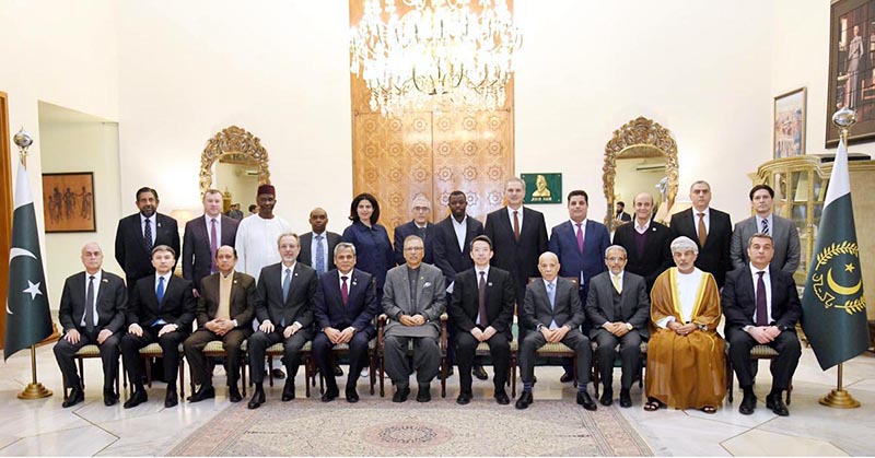 President Dr Arif Alvi in a group photo with officials and diplomats at the 29th anniversary celebration of the Commission on Science and Technology for Sustainable Development in the South (COMSATS), at Aiwan-e-Sadr
