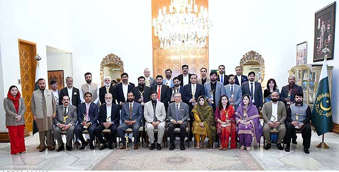 President Dr. Arif Alvi in a group photo with the winners of the 2nd Islamabad Chamber of Small Traders and Small Industries achievement trophies at Aiwan-e-Sadr