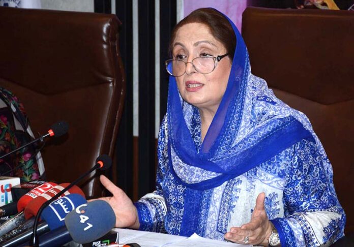 President Faisalabad Women Chamber of Commerce and Industry (FWCCI) Ms. Rubina Amjad addressing a press conference at FCCI Complex.