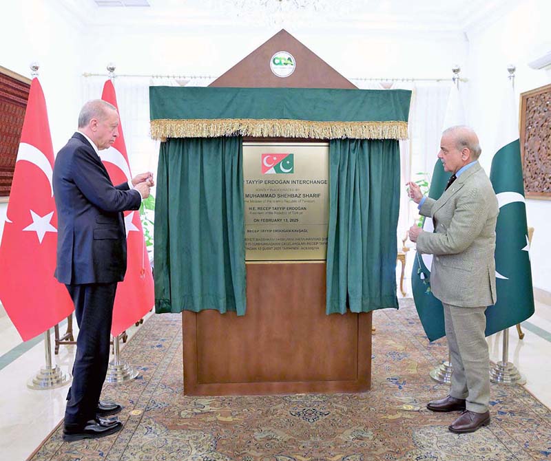 ISLAMABAD: February 13 – President of Turkiye, Recep Tayyip Erdogan and Prime Minister of Pakistan Muhammad Shehbaz Sharif unveil the plaque of F-8 Interchange names after Recep Tayyip Erdogan. APP/TZD/ABB