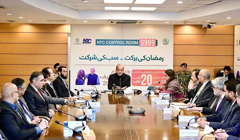 Prime Minister Muhammad Shehbaz Sharif addresses a meeting organized to review the monitoring of the disbursement of Ramzan Package 2025 at the National Telecommunications Corporation.