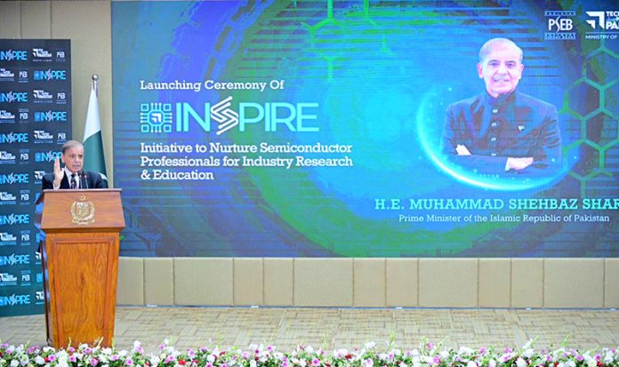 Prime Minister Muhammad Shehbaz Sharif addresses the launching ceremony of Inspire, an Initiative by Ministry of Information Technology to nurture Semiconductor professionals for industry research and education.