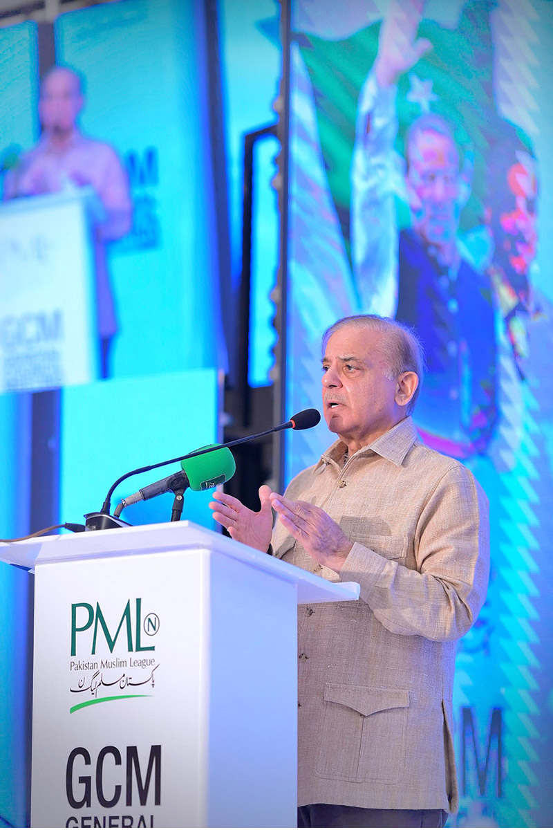 Prime Minister Muhammad Shehbaz Sharif addressing the General Council Meeting of PML-N