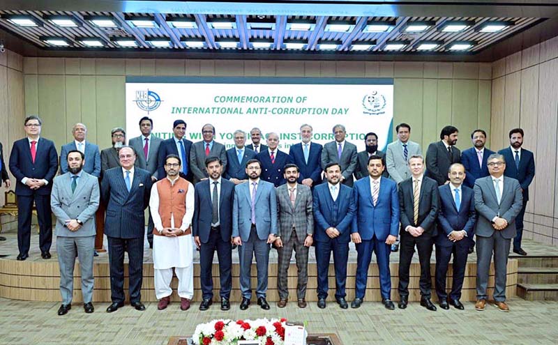 Prime Minister Muhammad Shehbaz Sharif and Federal Ministers in a group photo with Officers of NAB, on International anti-Corruption Day Seminar.