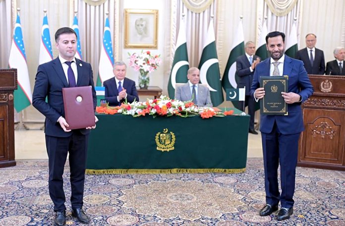 Prime Minister Muhammad Shehbaz Sharif and President of Uzbekistan Shavkat Mirziyoyev witnessing the MOUs exchanging ceremony between Pakistan and Uzbekistan.