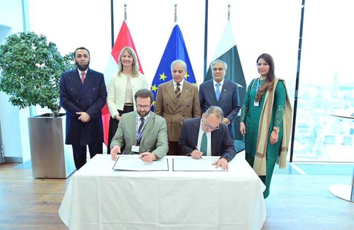 APP51-160226 VIENNA: February 16 –APP52-160226 VIENNA: February 16 – Prime Minister Muhammad Shehbaz Sharif and Vice President of Austrian Federal Economic Chamber Carmen Goby witnessing the signing ceremony of MOU between Pakistani and Austrian companies. APP/TZD/FHA