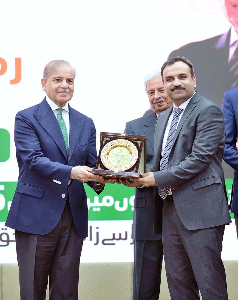 Prime Minister Muhammad Shehbaz Sharif awarding shields to the officers of public and private sector organizations in acknowledgement of their services for Ramzan Relief Package