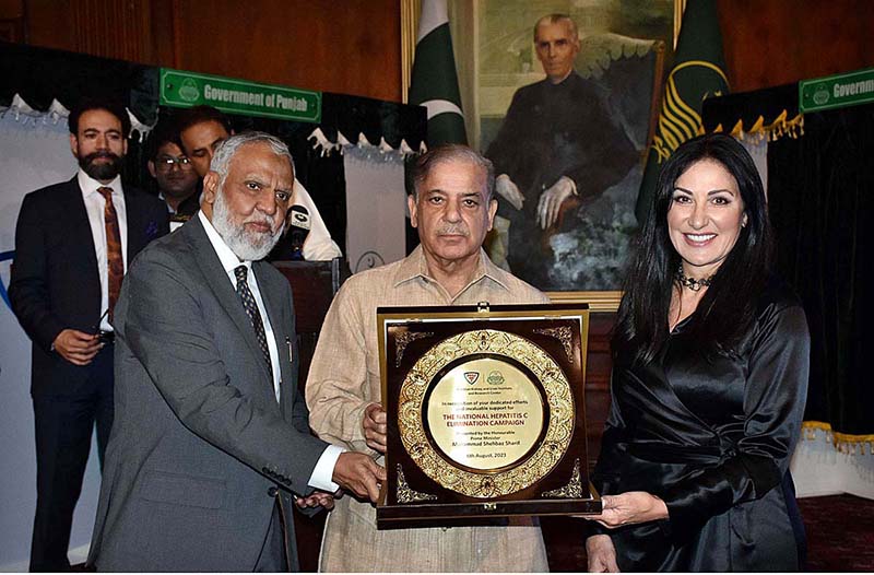 LAHORE: August 06 - Prime Minister Muhammad Shehbaz Sharif giving the best performance shields to the Staff members of PKLI and Health professionals during the groundbreaking ceremony of PKLI University and Launching of the National Hepatitis C Elimination Campaign. APP/MTF/TZD/ZID