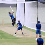 Previous Post New Zealand team take part in a practice session at the Qaddafi Cricket Stadium during a five-match Twenty20 series.