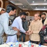 Prime Minister Muhammad Shehbaz Sharif interacting with families of labourers at a luncheon he hosted in their honour on the occasion of Labour Day.