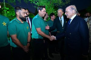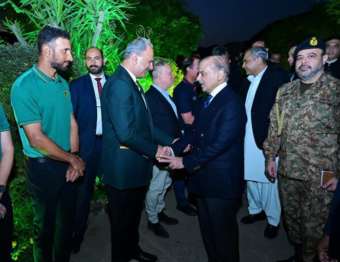 Prime Minister Muhammad Shehbaz Sharif interacts with the management and players of Pakistan Cricket team