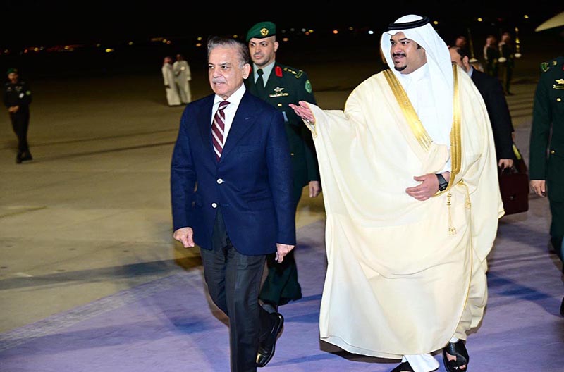 Prime Minister Muhammad Shehbaz Sharif is being received by Deputy Governor of Riyadh Region HRH Prince Mohammed bin Abdulrahman bin Abdulaziz at the Royal terminal of Riyadh International Airport