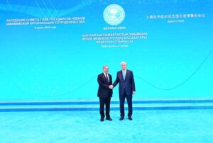 Prime Minister Muhammad Shehbaz Sharif is being received by President of Kazakhstan H.E. Kassym-Jomart Tokayev as he arrives at the Independence Palace of Astana to attend Shanghai Cooperation Organisation Summit.