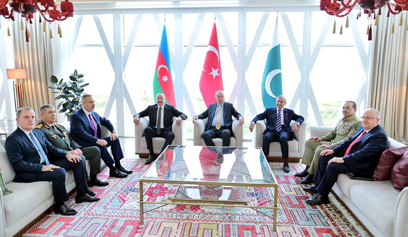 BAKU: November 08 - Prime Minister Muhammad Shehbaz Sharif meets with President of Turkiye H.E. Recep Tayyip Erdogan; Chief of the Army Staff Field Marshal Syed Asim Munir is also present. APP/ABB/FHA
