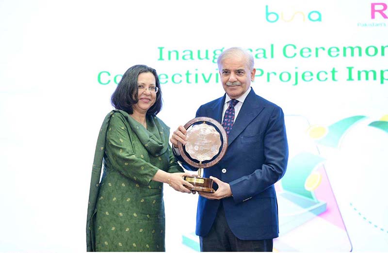 Prime Minister Muhammad Shehbaz Sharif presenting a memento to Dr. Anita Zaidi, President, Gender Equality Division, Gates Foundation at the inaugural ceremony of Buna-Raast Connectivity Project Implementation Phase
