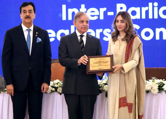 Prime Minister Muhammad Shehbaz Sharif presenting a souvenir to Advisor to Chairman Senate and Ambassador to ISC Misbah Khar at the inaugural session of the Inter-Parliamentary Speakers’ Conference “Peace, Security and Development”.