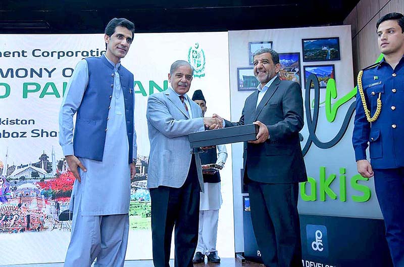 Prime Minister Muhammad Shehbaz Sharif presenting souvenir to Irani Minister for Culture and Tourism Ezzatollah Zarghami on the launching ceremony of Pakistan’s tourism brand ‘Salam Pakistan’