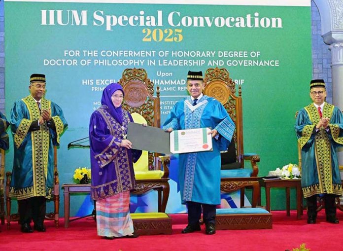 APP11-071025 KUALA LUMPUR: October 07 –APP12-071025 KUALA LUMPUR: October 07 – Prime Minister Muhammad Shehbaz Sharif receives an honorary degree of Doctorate of Philosophy in Leadership and Governance conferred upon him by the International Islamic University of Malaysia. APP/TZD