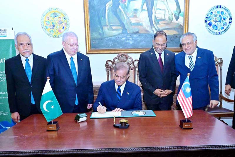 Prime Minister Muhammad Shehbaz Sharif records his remarks in the visitors’ book of the International Islamic University of Malaysia.