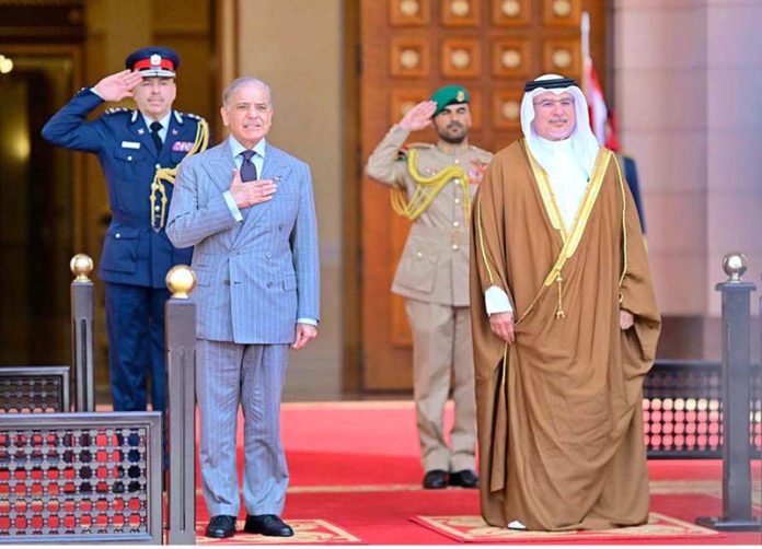 APP26-261125 MANAMA: November 26 –APP27-261125 MANAMA: November 26 – Prime Minister Muhammad Shehbaz Sharif reviews guard of honor at the Al-Qudaibiya Palace. APP/TZD/ABB