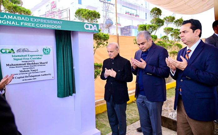 ISLAMABAD: December 18 – Prime Minister Muhammad Shehbaz Sharif unveils the plaque of inauguration of Iqbal Flyover/T-Chowk Flyover and Islamabad Expressway Signal Free Corridor. APP/ABB