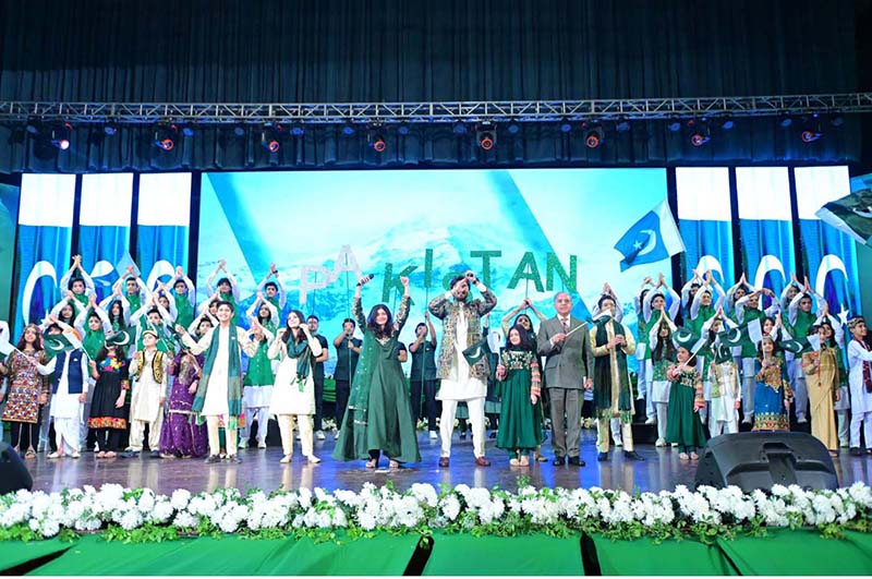 Prime Minister Muhammad Shehbaz Sharif with the singers and students who performed at the Independence Day event