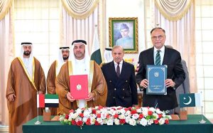 Prime Minister Muhammad Shehbaz Sharif witnessing the signing of an MoU of cooperation between Pakistan and the UAE, signed by Federal Minister for Planning and Development Dr. Ahsan Iqbal and UAE’s Deputy Minister of Cabinet Affairs for Competitiveness and Knowledge Exchange H. E. Abdulla Nasser Lootah