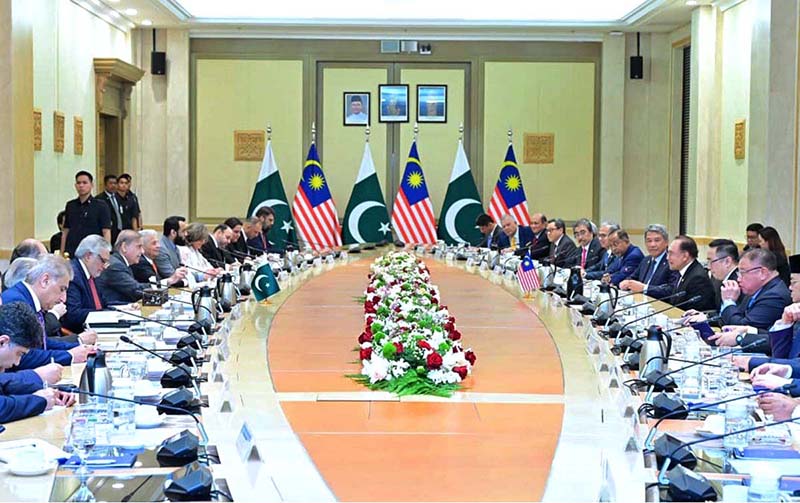 Prime Minister of Pakistan Muhammad Shehbaz Sharif and Prime Minister of Malaysia Dato Seri Anwar Ibrahim in delegation level talks at Purdana Putra (Malaysian Prime Minister’s Office).