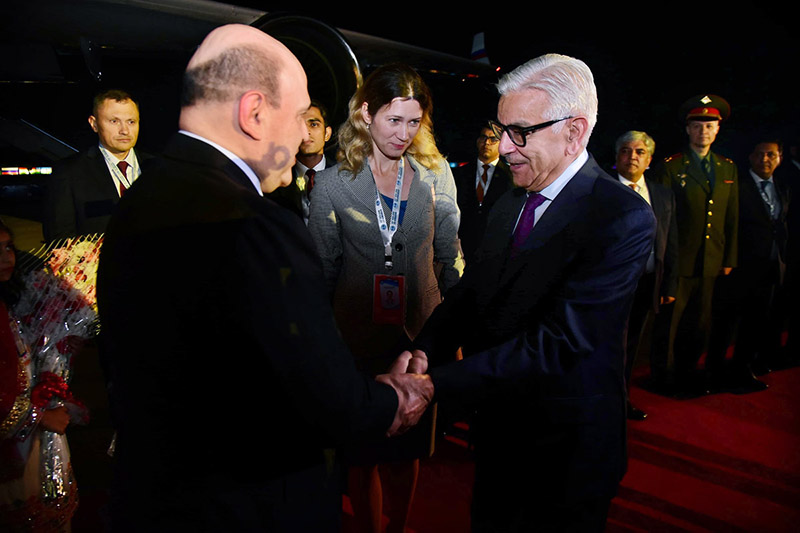 Prime Minister of Russia, Mikhail Mishustin , arrives in Pakistan to attend the 23rd SCO conference. Federal Minister for Defence Production Khawaja Muhammad Asif welcomes the Prime Minister of Russia at Islamabad International Airport.