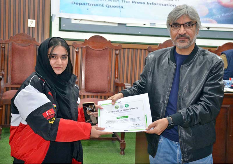 Professor Zerak Naiz distributes certificates to participants at the conclusion of a seminar on countering extremism through digital media literacy, aimed at strengthening youth resilience against disinformation and narrative manipulation, organized by PID Quetta