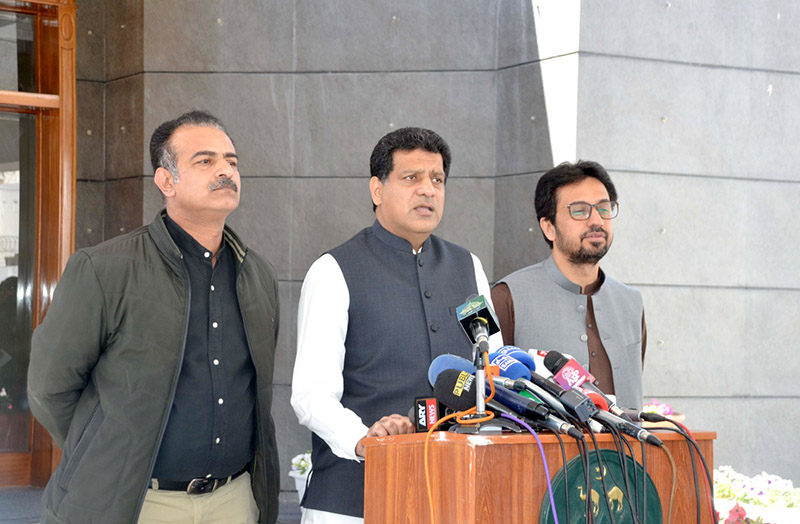Provincial Ministers, Zahoor Ahmed Buledi, Shoaib Nosharwani and Balochistan Govt Spokesperson Shahid Rind addressing press conference regarding improvement of law and order situation in the province